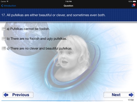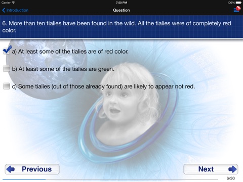 This test consists of 30 items. Every item includes a statement and three corollaries – logical sequents of the statement. Only one corollary out of three is correct. Your task is to select correct logical sequents.