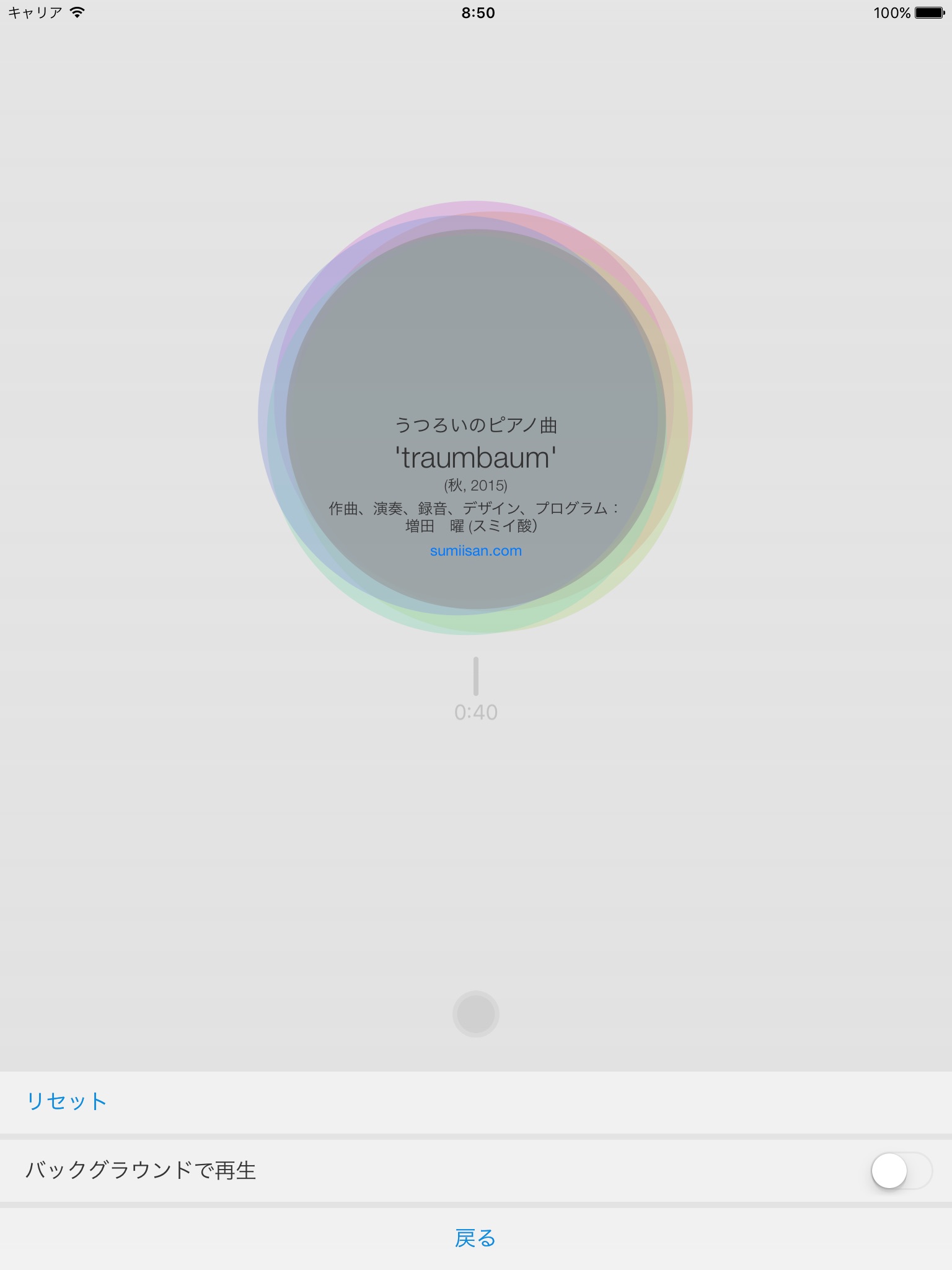 traumbaum is an ever-changing piano piece with no end. If you want to relax yourself with some calm piano music, just launch this app, and you can listen to it as long as you like.