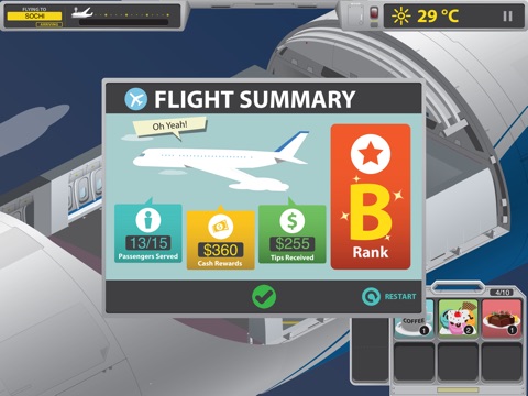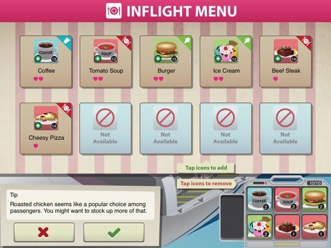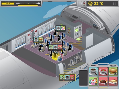 As players progress, they can upgrade their cart to move faster, hold more food and many more. Upgrades will allow players to get better service grades and eventually to complete harder levels up to 30 levels of inflight mayhem.