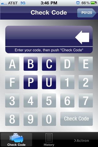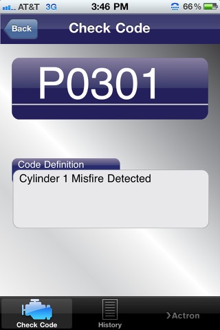 Just enter your code (you need a code reader or scan tool to retreive it or a technician may have told you the code) in the OBD II InfoMobile Lite and hit “Check Code”. Instantly, your code definition will be retrieved. This little gem also keeps a history of your codes so you don’t have to.
