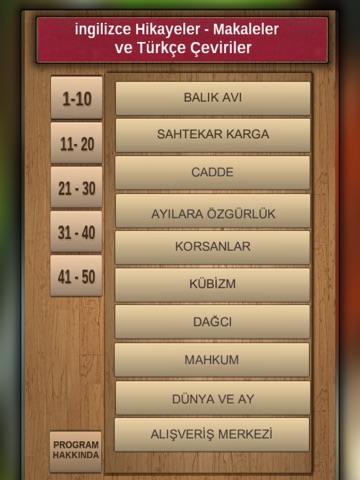 Uygulama 50 adet "ingilizce - Türkçe, Kısa Hikayeler, Makaleler ve Paragraflar" içermektedir.