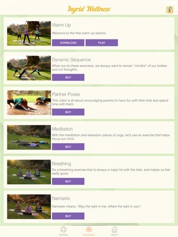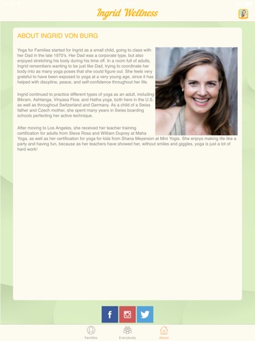 Yoga for Families started for Ingrid as a small child, going to class with her Dad in the late 1970s. Her Dad was a corporate type, but also enjoyed stretching his body during his time off. In a room full of adults, Ingrid remembers wanting to be just like Dad, trying to coordinate her body into as many yoga poses that she could figure out. She feels very grateful to have been exposed to yoga at a very young age, since it has helped with discpline, peace, and self-confidence throughout her life.