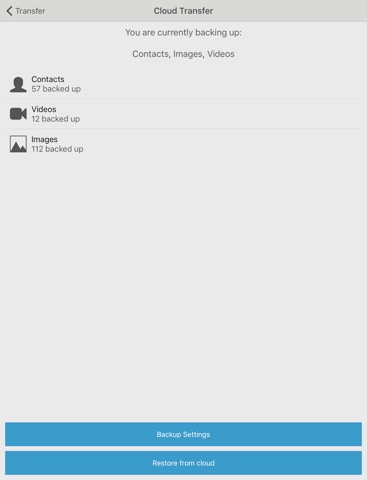 Supported content for backup and transfer: contacts, pictures and videos.