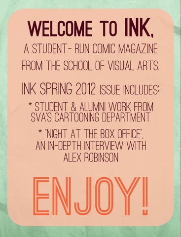 INK the world’s first 100% student-run comics magazine app. INK showcases the School of Visual Arts’ diversely talented comics storytelling students, alumni, and faculty.