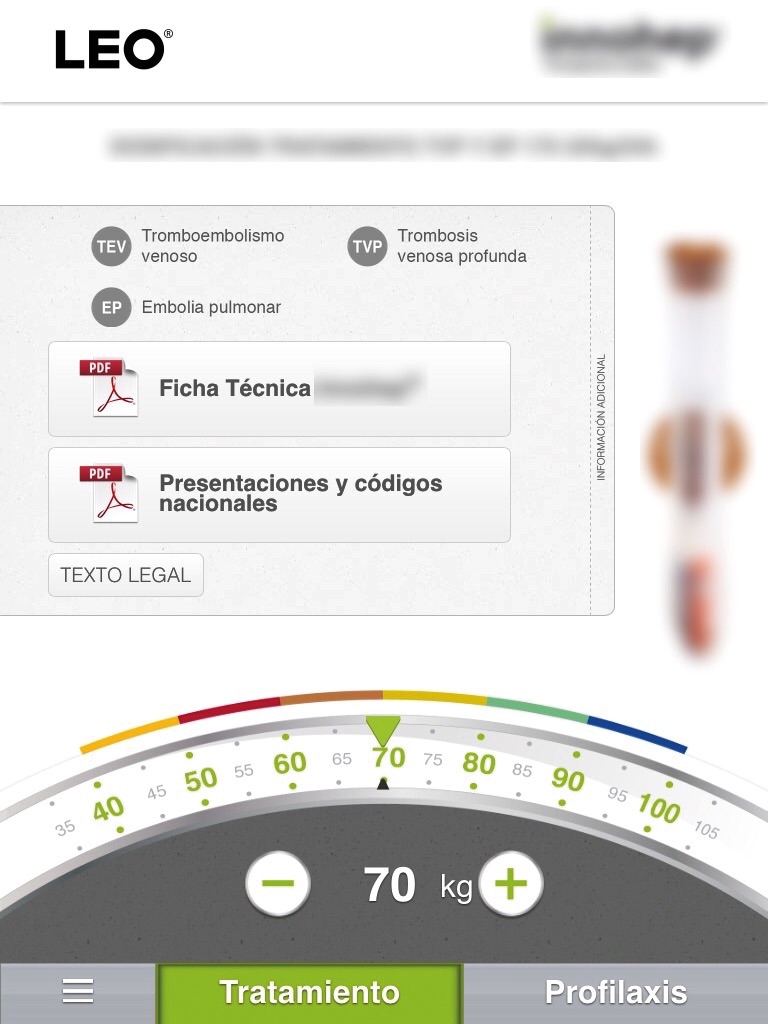 innodosis en su versión para iPhone, iPad y iPod Touch es una APP desarrollada por Leo Pharma para facilitar al profesional sanitario un cálculo con referencia a las presentaciones de heparina de bajo peso molecular a prescribir para la profilaxis y el tratamiento de la Enfermedad tromboémbólica venosa, dependiendo de la condición clínica o del peso del paciente, respectivamente. Esta aplicación de software es para uso exclusivo de profesionales sanitarios con capacidad de prescribir o dispensar medicamentos.