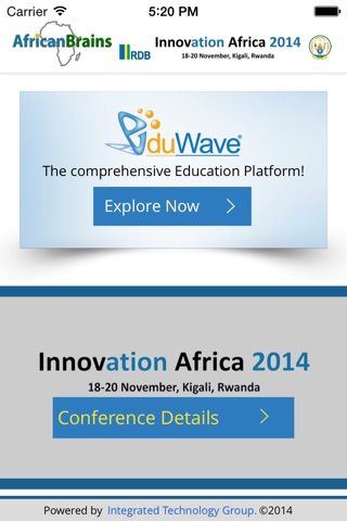 This app has been developed by Integrated Technology Group (ITG), with the cooperation of AfricanBrains. The updated conference app will be available from the first day of the event, so please look out for announcements via our website - http://innovation-africa.com/2014/itg-app and social networks as to be informed of when it will be launched.