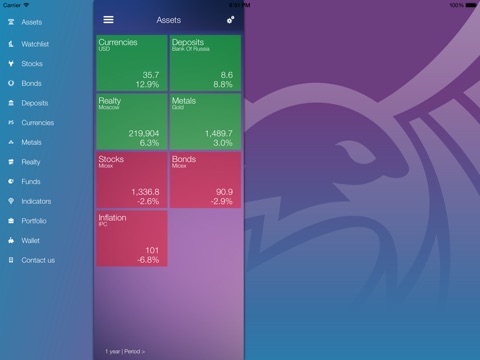 It enables you to see Russian investment picture, compare different investments instruments (stocks, bonds, deposits, metals, currency, realty, funds), see main worldwide indicators, monitor your personal budget, create an investment portfolio.