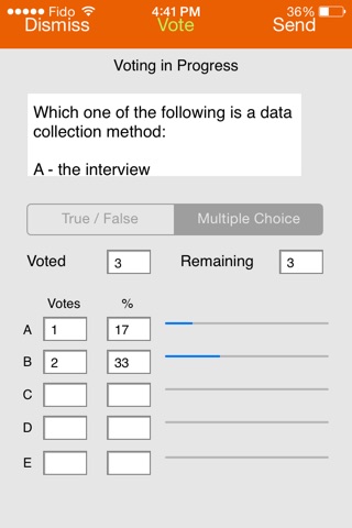 True/False, Multiple Choice, or Verbal questions can be sent to the students. Student results are tabulated and shown in real-time to the Teacher’s Assistant.