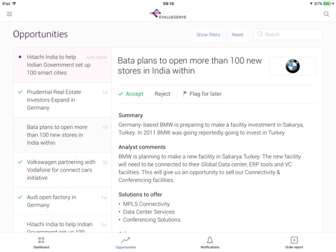 Evalueserve Insights app is a simple way to source high quality custom research and analytics. From proactive alerts to tailored reports for your industry, our platform delivers the intelligence you need every day – across Procurement & Supply Chain, Sales, Marketing and Strategy functions.