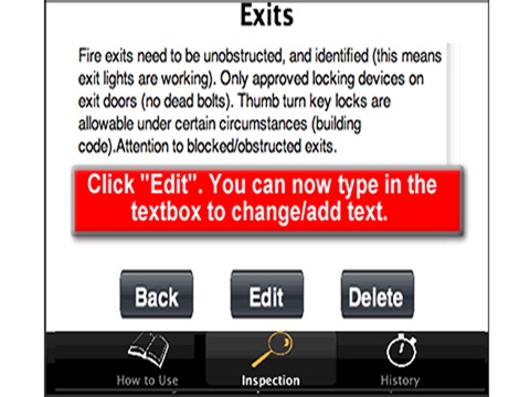 This app is designed for use by those who perform facility/area inspections for fire prevention, safety, maintenance, storage, occupancy, etc. It includes the inspection and history features of the basic Inspect-It App plus a customization component that allows the user to easily customize the inspection to meet his/her needs and local requirements. The Inspect-It Plus App also enables the inspector to take pictures, record and save results and email the results and pictures easily and quickly to create a permanent record of the inspection.