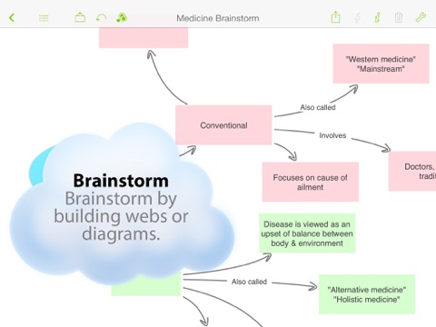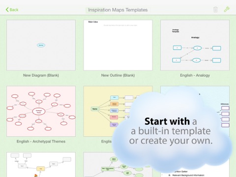 Create concept maps, cause and effect diagrams, process flows, family trees and more! Getting started couldn’t be easier: Simply double tap a blank space on your canvas to create a new idea symbol. Start from scratch or from one of the many built-in templates in language arts, history, science or thinking & planning!