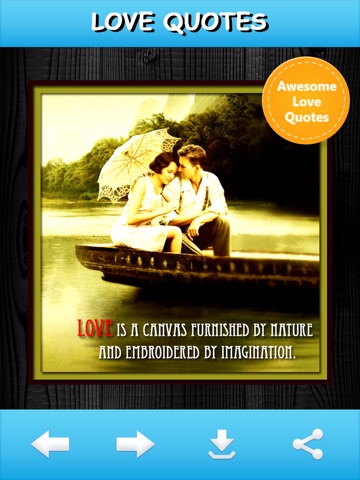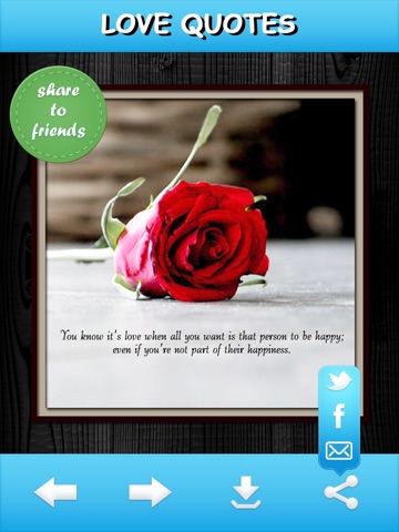Love Quotes app lets you browse different love quotes with awesome images, save it to your photo album, send them to your friends through Email, Facebook and Twitter.