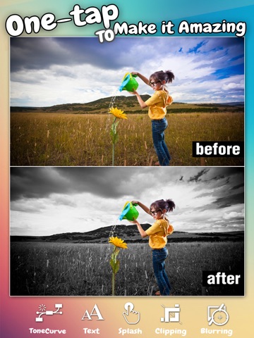 With instaFotos its All in One, you can enhance your photos with Filters, Effects, Blur & Focus, Brightness, Contrast, Saturation, Sharpness, Rotate, Crop, Resize, ToneCurve, Splash, Text (different Fonts available) and Stickers, Framesapply effects, and so much more!
