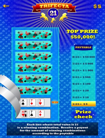 Add up the value in each line. Each line whose total value is 21 is a winning combination. Receive a payout for the amount of winning combinations according to the Pay Table.