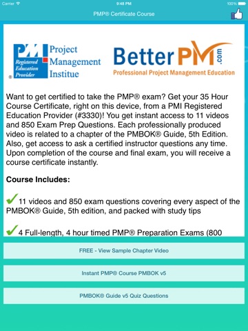 Want to get certified or prepare to take the PMP® exam? Get your 35 Hour Course Certificate, right on your iOS device with our Video PMP® Course! We are REP #3330, and fully authorized to grant PMP® Prep Certificates.