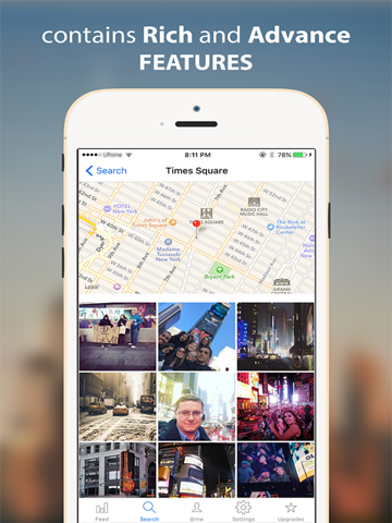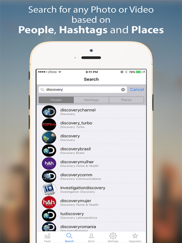 - Search for users, hashtags, locations etc.