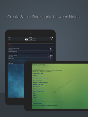 Though we make Instantly very powerful and easy to use, we are not stopping. There’re still many features that we think are useful for you: Save and edit on your Mac or PC, iCloud sync, Notification, Calculator, iOS new features, Attach Voices or Photos (if you think it necessary)... we will make the next version even better! Please support us!