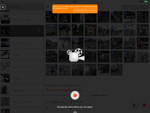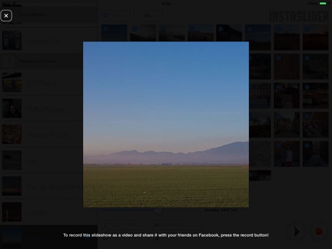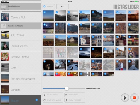 Instaslider creates beautiful KenBurns slideshows from your facebook photos, photos from your phone, instagram or 500px. It can be synchronised with music and share the final movie with your friends on facebook.