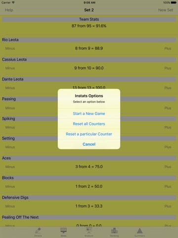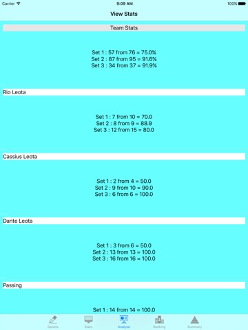 An App that is not overwhelmed with so many variables to track, InStats 1.0 only has a "Plus" and "Minus" button in which the coach only needs to push one or the other for a positive or negative contribution towards the teams performance. At the end or during a game the coach can get a Set/Game summary of how each individual performed. Also, the coach can view the ranking feature that ranks players performance to get instant feedback of who is playing the best to worst, thus making decisions easier.