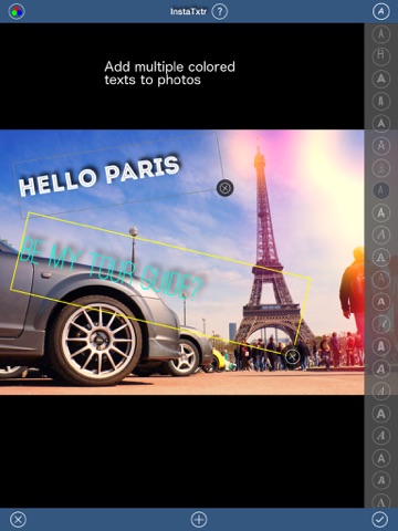 You can add multiple texts to photos. Each text can have its own color or font type. And you can use pinch & touch gestures to scale, rotate & position texts respectively. InstaTxtr also comes included with some templates for you