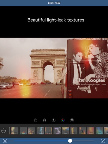 InstaTxtr has 69 overlays/textures which let you apply light leaks, fancy lights to your photos. You can easily tweak the colors of overlays to make them blend best with your photos!