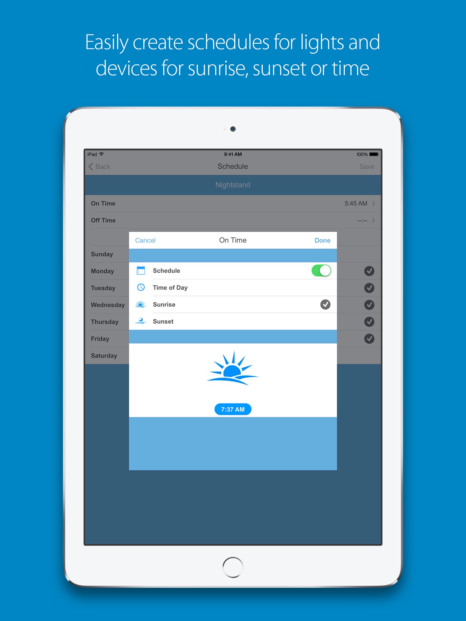 • Auto-detect of geo-location of smartphone to calculate sunrise/sunset and automatic time synchronization