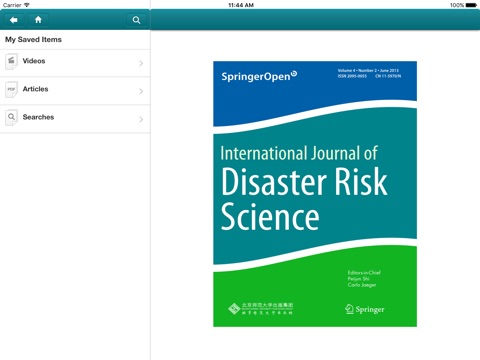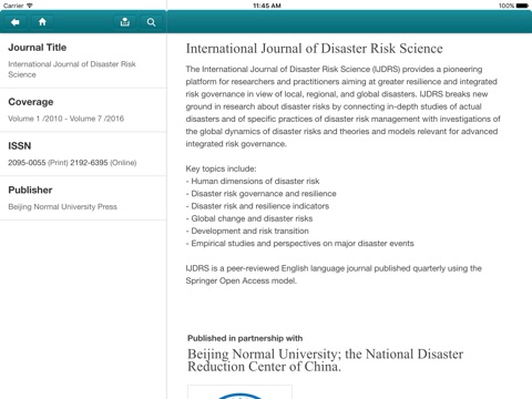 Tap into the most recent developments in all aspects of disaster risk science with the International Journal of Disaster Risk Science app. The International Journal of Disaster Risk Science (IJDRS) is a peer-reviewed English Language open access journal published by SpringerOpen. The Journal continuously publishes articles on theoretical and methodological issues in all areas of disaster risk science: emergency response technology and risk management; risk governance policies and regulations. Coverage includes case studies and research comparing responses to major disasters worldwide.