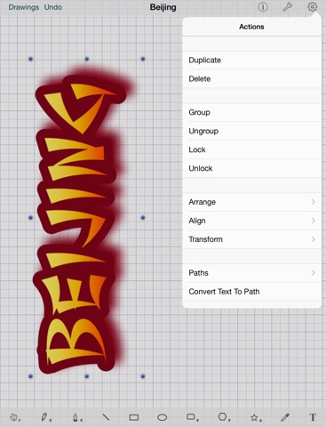 Intaglio Sketchpad provides a full set of drawing tools and capabilities re-imagined for the multi-touch environment. For example, use one finger to draw or select a graphic or use two fingers to rotate it. Hold your thumb on a tool button while drawing to constrain the object. You can edit shapes using a multi-touch pen tool or cut the path with a scissors tool and adjust the width of a text column by pinching it. Sketchpad includes predefined shapes in a graphics library you can customize. You can create sophisticated graphics with advanced features such as masks, drop shadows, boolean path operations, dashed lines and arrows.