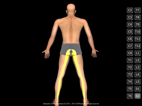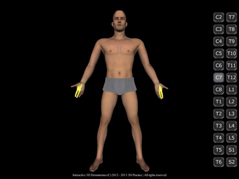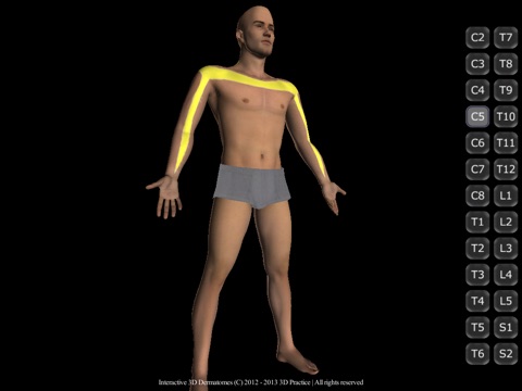 Theres nothing like this app on the market for viewing Dermatomes in 3D. Scrollable vertebral buttons include C2 through S2. Select any button to see corresponding dermatomal patterns in 3D detail. Utilizing a powerful 3D graphics engine this app supports multi-touch gestures to turn and rotate the model 360 degrees, pinch to zoom in and out.
