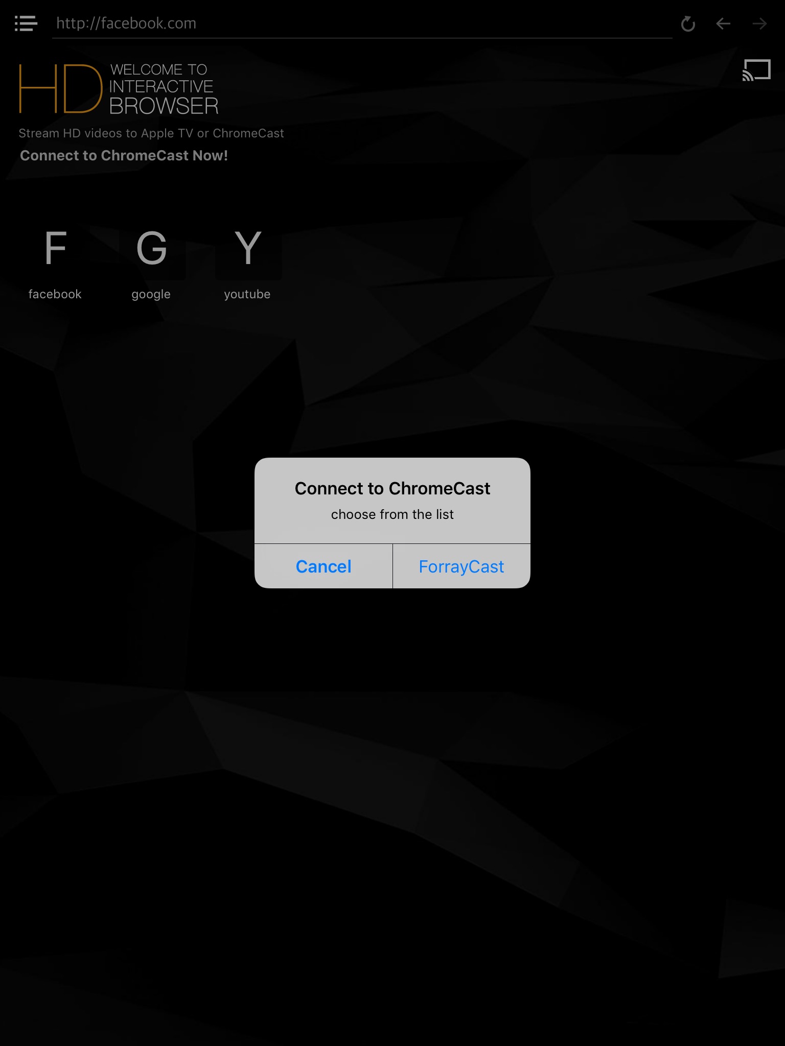 HD Browser is a new App for iPhones and iPads for streaming videos in HD quality to Apple Tv or ChromeCast device. This application is playing live and vod videos, and audio automatic on the connected streaming device.