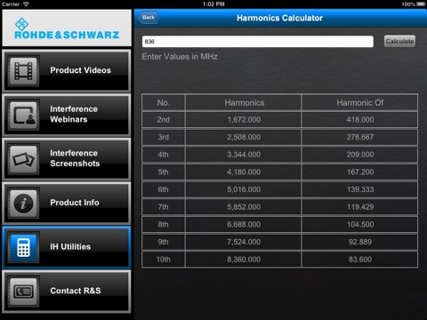 Interference Hunter provides technical information on how to track down interference. This App provides information on what signals are expected in various portions of the spectrum, including Utilities such as Frequency Lookup, Harmonic Calculator, and a pdf of the US Spectrum. Screen shots provide a quick reference for use in the Field including pictures of various types of common interference. Interference Hunter can also provide information on how to use Rohde & Schwarz equipment for Interference Hunting, product specifications, and support line contact information.