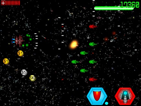 Guide the Intergalactic Ninja Pirate through space as the aliens invade! Use your left thumb to control the movement of your spaceship, and your right thumb to use special weapons as you buy them. This is a retro style ship shooter that will have you addicted in seconds. Upgrade your space ship at the space station before setting out to destroy the aliens from another planet. Green Aliens will die easy, but the red ones will take some more powerful weapons to destroy. Collect money that drops from the aliens and choose to upgrade your guns, missiles, laser, or shield. Mastering this classic arcade game will take some practice. Compete for the high score with your friends, or against the rest of Earth on the global high score list.