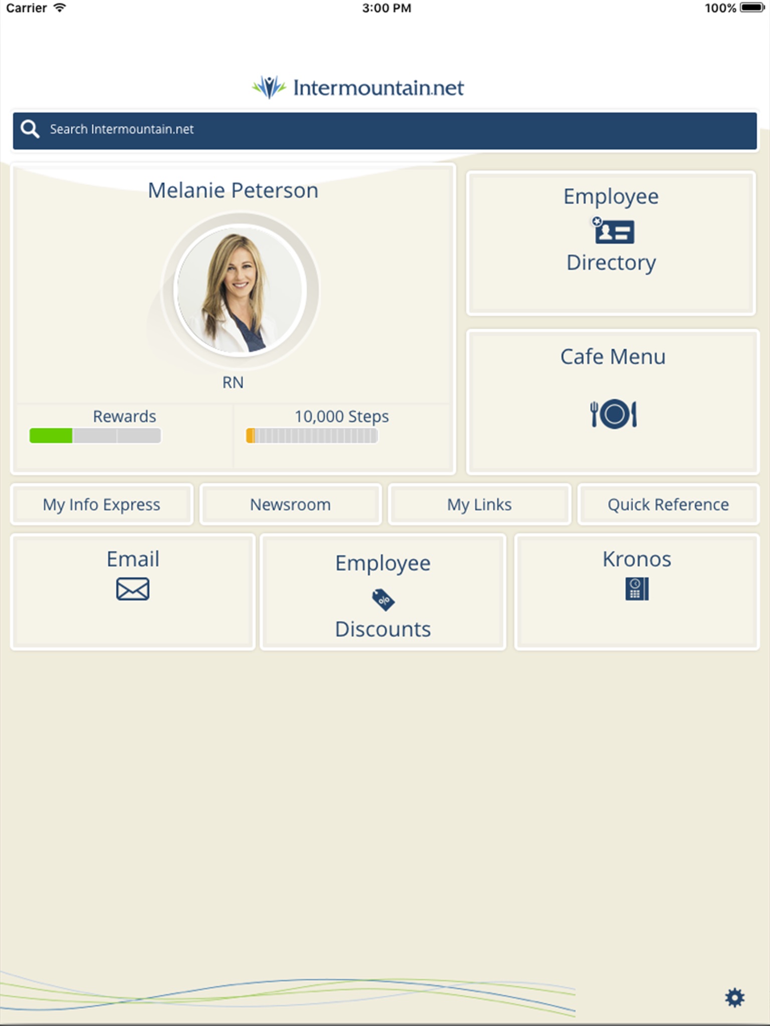 The Intermountain Employee app gives convenient on the go access to the tools you use most. As an employee of Intermountain, you will be able to track your progress in the employee health reward program, or find daily specials and menus at several of our onsite café’s as well as look up an employee via the employee directory.