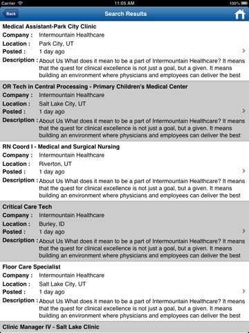 The Intermountain Healthcare Careers app allows you to instantly search and share highly targeted jobs from our hospital system, from anywhere! Designed to meet and exceed your needs as you search for your next great job on the go, this app will ensure that you are up-to-date with the latest job opportunities in your area of interest. Download the app to start searching jobs instantly.