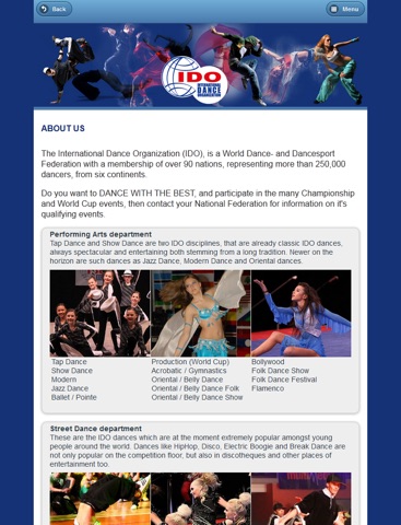 The International Dance Organization (IDO) App on your mobile. With this new IDO App you are always online to check the most important IDO news, competitions and results – always to be informed and updated about what is up in IDO!