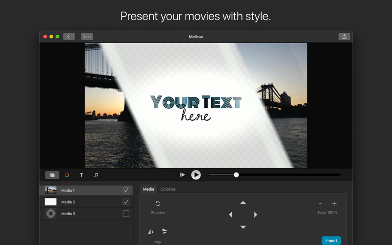 Create impressive intros, inserts, announcements and film credits for any movie project! IntroMate includes a stunning library of customizable templates to make you a movie director in minutes!