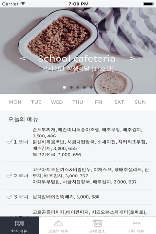 학생식당, 카페테리아식당, 기숙사식당, 사범대식당, 교직원식당 메뉴 및 교내업소를 확인 할 수 있습니다.