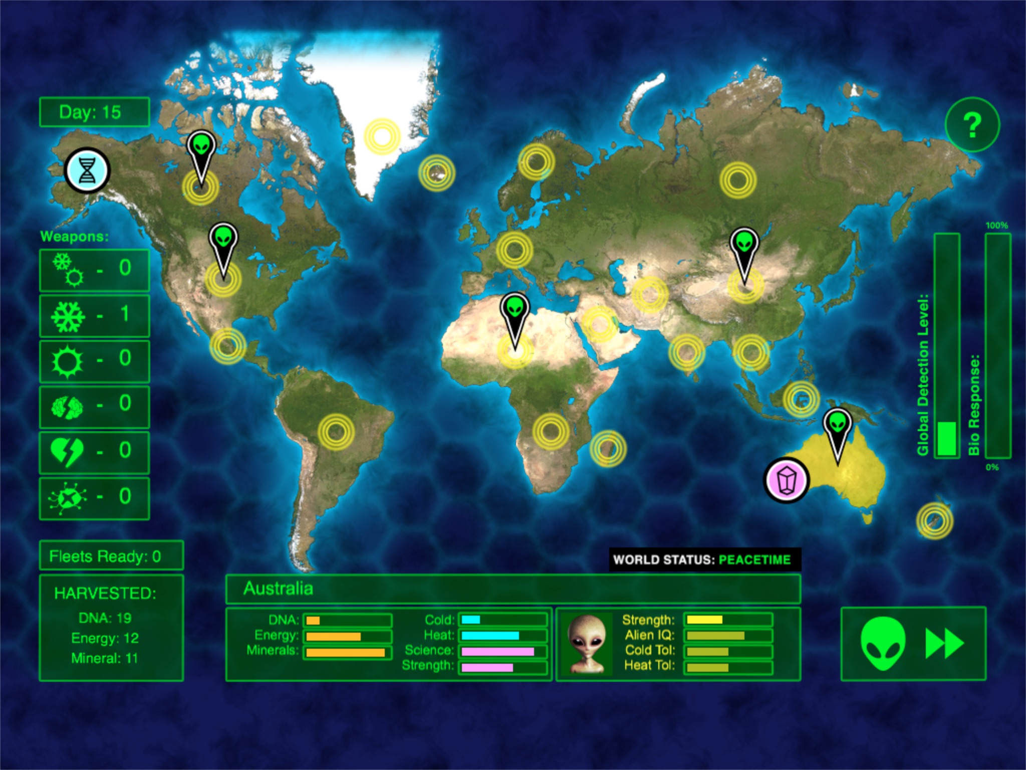 Choose from real alien races commonly believed to visit earth - including Greys, Reptilians and Insectoids. Each race has their own strengths and weaknesses making for challenging gameplay. Conquer the globe to unlock new alien races.