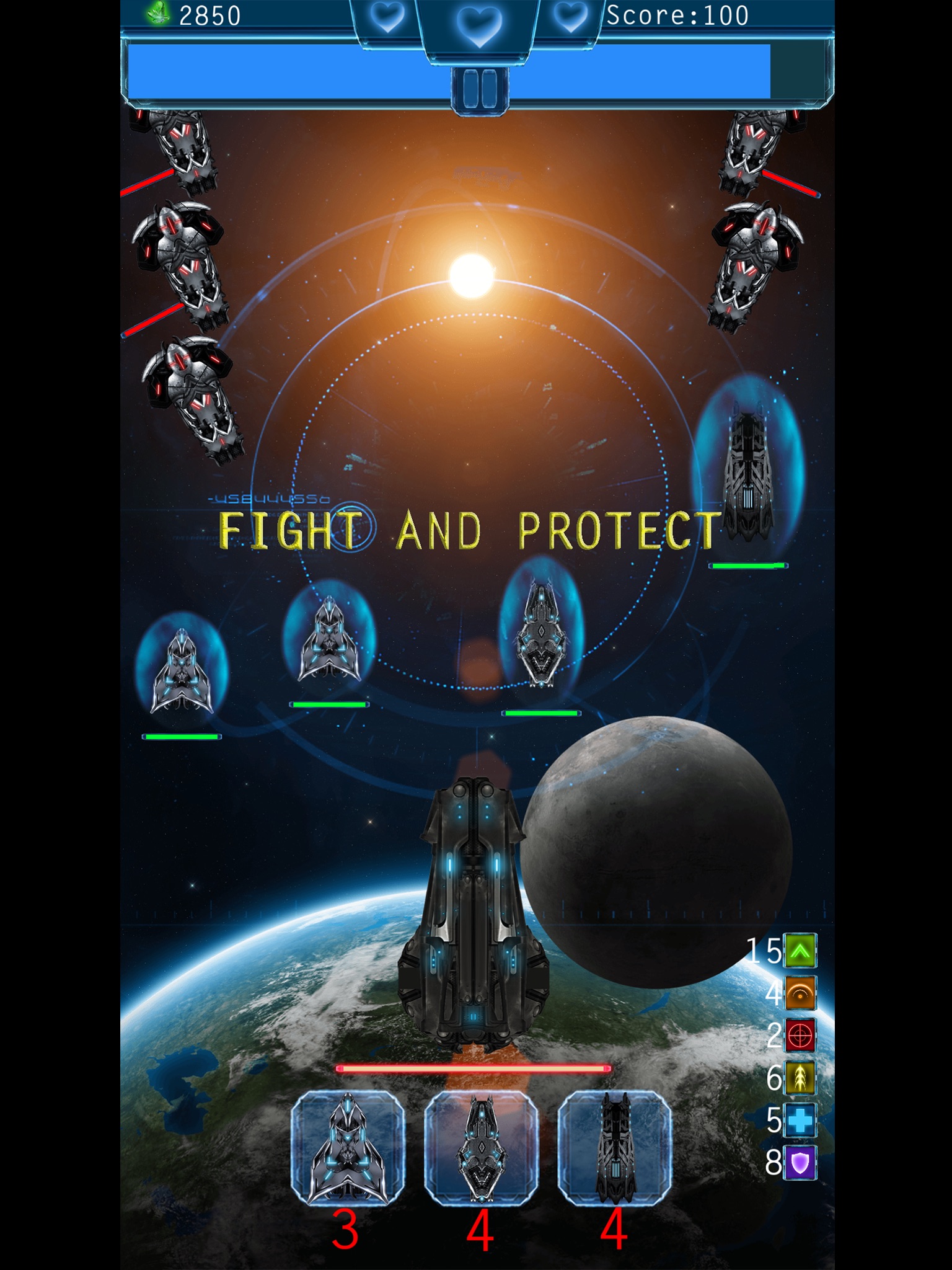 Fight against an alien invasion, protect your space station, mothership(destroyer) and protect other planets against invasions.