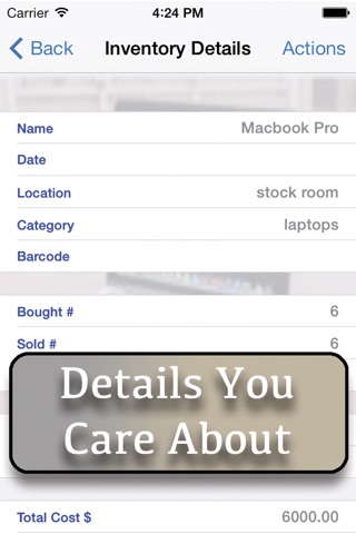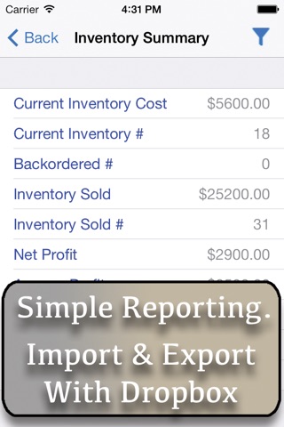 Inventory Now helps you view a snapshot of all of your inventory. When you buy new inventory, you tell the app about it. As your products get received, sold, shipped and delivered, you mark them as so within the app. This lets you, at any time, see an overview of your inventory and the number of items that are in a particular status.
