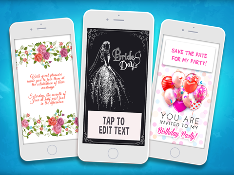 Are you searching for an original way in which to invite someone to your wedding or to your birthday party? In this app, you can find all the current designs and fashionable templates to make your dream invitations! Search through a variety of invitation cards and choose the one that is most appealing to you! You can write your own messages on them, and personalize each one! There is no need to write real cards and waste paper, be trendy and send an original electronic invitation card!