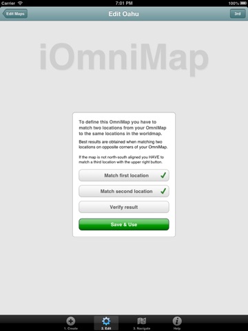 Ever wanted to be able to use special maps provided by national parks, tourist information, travel planners, guidebooks or any other source directly on your iPhone/iPad? Ever found yourself looking back-and-forth between a physical map and your iPhone/iPad showing your position? iOmniMap is the solution, it lets you import these maps by photographing or downloading them, and after youve defined the position of the map on the world you can directly navigate inside the map, i.e. iOmniMap will show you your GPS position right within the imported map. iOmniMap can even show your heading direction within the imported map.