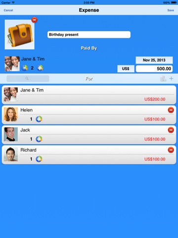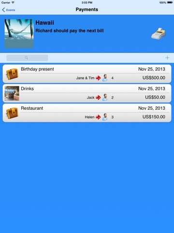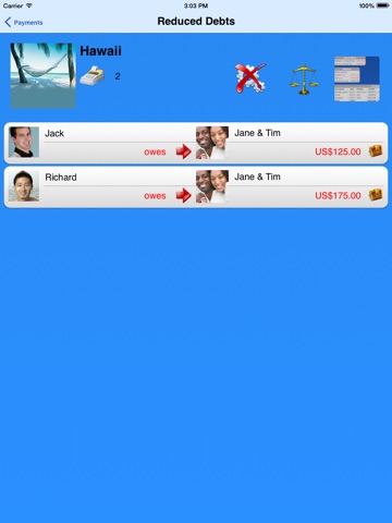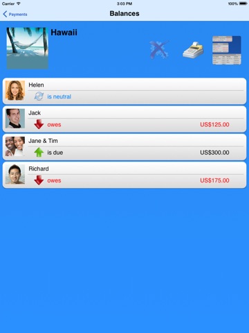 This app is the best when it comes to sharing expenses in a group and I have tried a few. Very easy to use with reports that can be sent by email. I would like to have iCloud sync between my iPhone and iPad but I can always email myself and import the attachment. I like that it imports the pictures I had on my contacts when I set them up. Definitely worth my 2 bucks many times over.