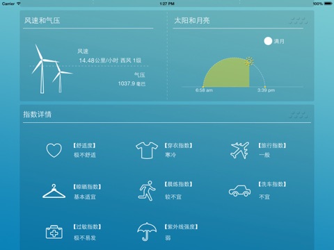 多城市切换,随时了解TA那边的天气状况,当天详细信息包括 空气指数,温度湿度, 风向降雨量,月相,海拔,还有每天出门防晒建议哦。