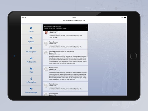 The IOTA GA 2016 app will support you throughout the General assembly, informs you about the logistics, the content of the programme, the participants and a overview of 20 years IOTA.