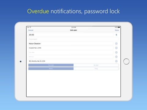 Die App ist super. Ich verleihe recht oft Geld und da wird es schwer, immer den Überblick zu behalten. Mit dieser App vergesse ich nichts mehr. Sehr zu empfehlen.