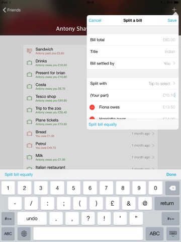 • "Split the bill" when someone buys something on behalf of one or more people. You can set each persons total individually or split the bill equally