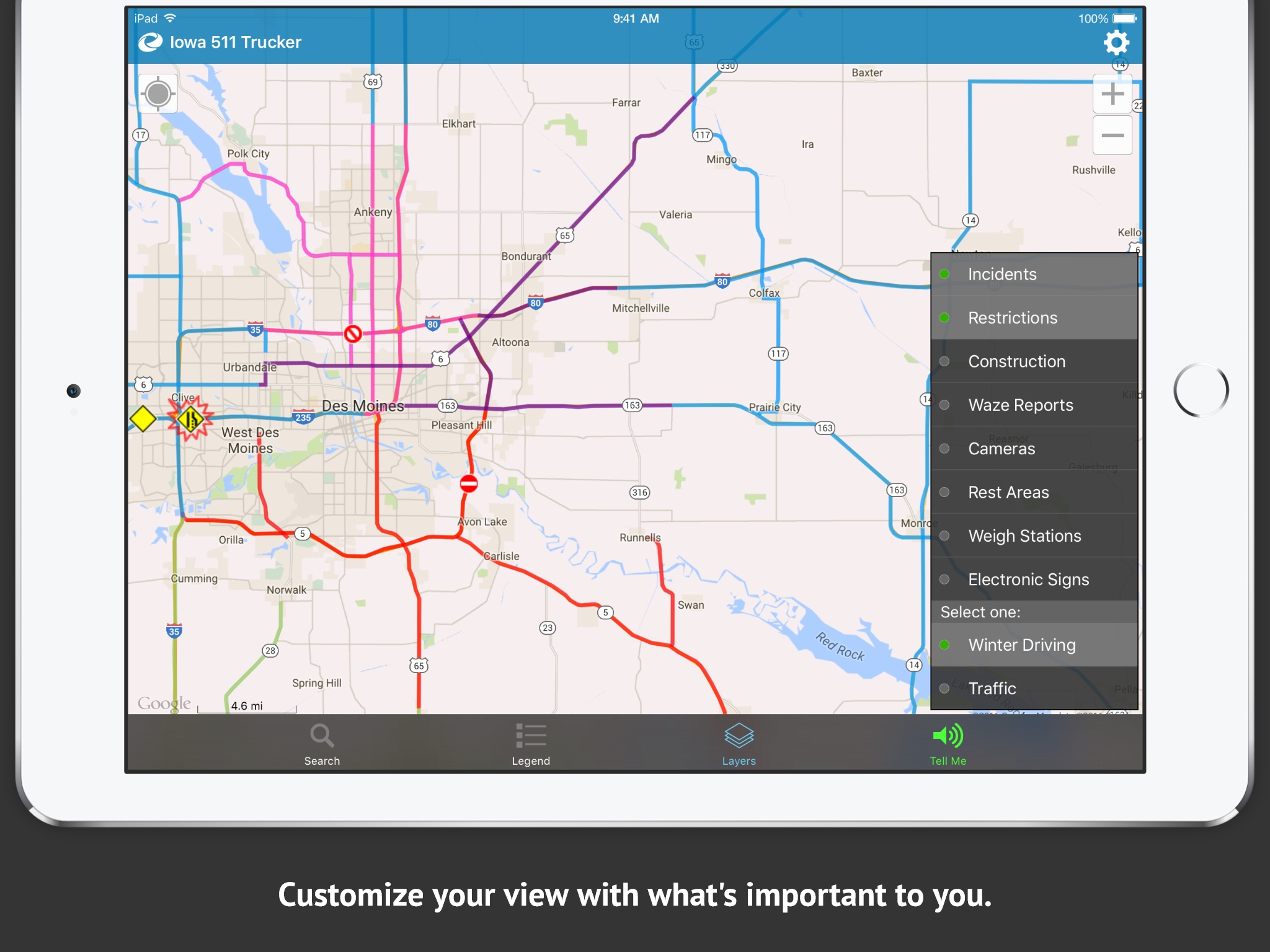 Iowa 511 Trucker is the Iowa Department of Transportations (DOT) official traffic and traveler information app for commercial vehicle operators. The Iowa 511 Trucker app provides statewide up-to-date traffic information for interstates, U.S. routes and state highways in Iowa. It does not include information for county roads or city streets.