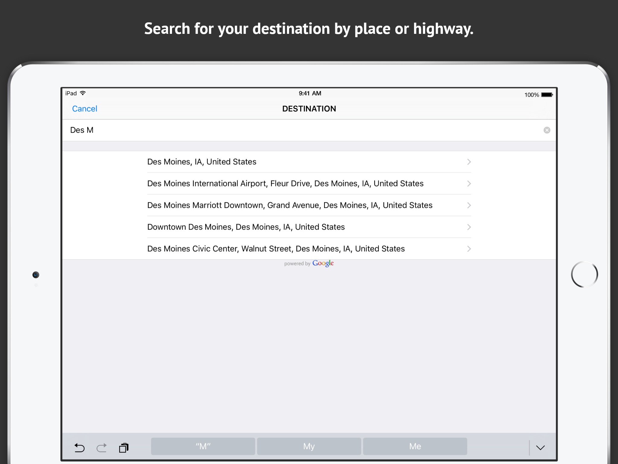 The primary responsibility of every driver is the safe operation of their vehicle. While traveling, mobile communication devices should be used only when the motor vehicle is at a complete stop off the traveled portion of the roadway. Do not text and drive (its against the law) or use this app while driving.
