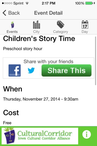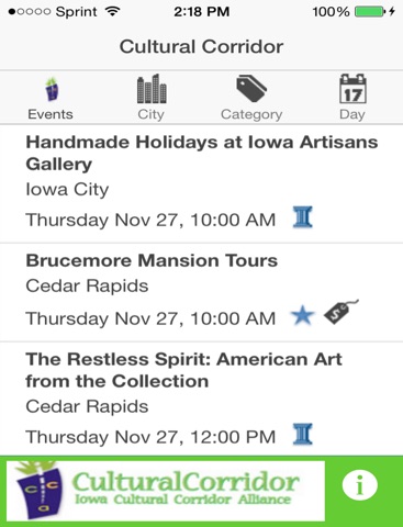 The Iowa Cultural Corridor Alliance mobile app will help you find a variety of great events in the Creative Corridor region. This includes Cedar Rapids, Iowa City, and the surrounding area. You can easily search by day, city, or event category. For more information about the Iowa Cultural Corridor Alliance, visit www.culturalcorridor.org